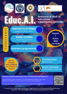 Il Centro Iniziativa Democratica Insegnanti di Messina, in collaborazione con l’Istituto Teologico San Tommaso, l’IIS Verona Trento e l’Associazione Salesiani Cooperatori organizza, venerdì 7 febbraio alle ore 16:00, presso l’Istituto Teologico San Tommaso di Via del Pozzo, un Seminario di studi su educazione e intelligenza artificiale dal titolo EDUC.AI. Dopo i saluti iniziali del Direttore dell’Istituto Teologico, prof. Don Giovanni Russo, ad introdurre i lavori, ponendo lo status quaestionis, sarà la prof.ssa Simonetta Di Prima, Dirigente dell’IIS Verona-Trento. A seguire, l’intervento del prof. Vincenzo Cicero, Associato di Filosofia Teoretica presso il Cospecs (Dipartimento di Scienze cognitive, Psicologiche, Pedagogiche e degli Studi Culturali) dell’Università di Messina. Il seminario proseguirà con gli interventi programmati e le domande dei docenti e degli studenti invitati a partecipare. Modererà i lavori il prof. Nicola Antonazzo, docente di Pedagogia Generale presso l’Istituto Teologico San Tommaso.