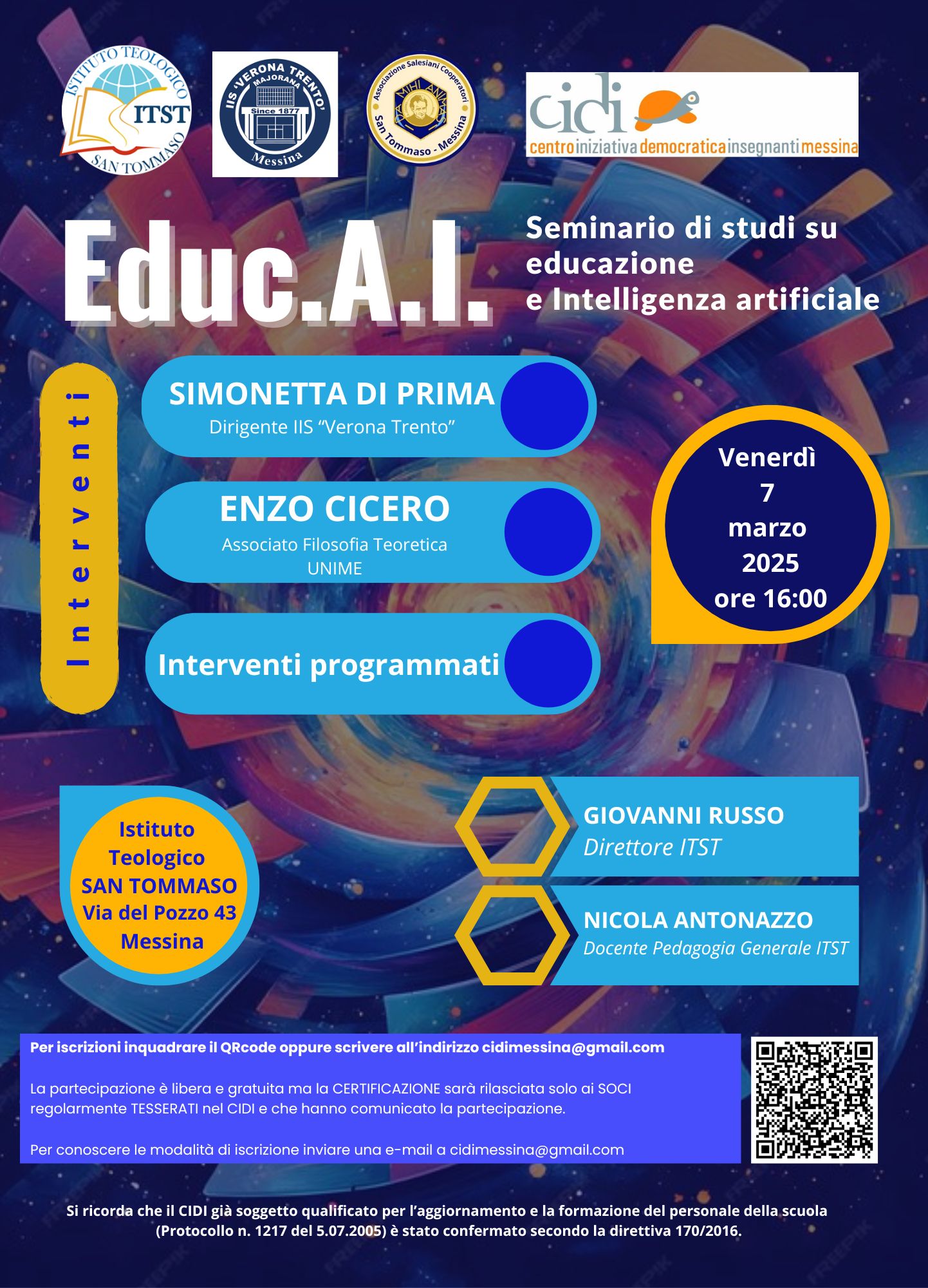 Il seminario rientra all’interno della proposta formativa del CIDI Messina e del programma di eventi ITST-SSSBS per il secondo semestre 2024/2025. Ai soci regolarmente iscritti al CIDI Messina verrà rilasciato l’attestato di partecipazione valido per l’aggiornamento professionale.